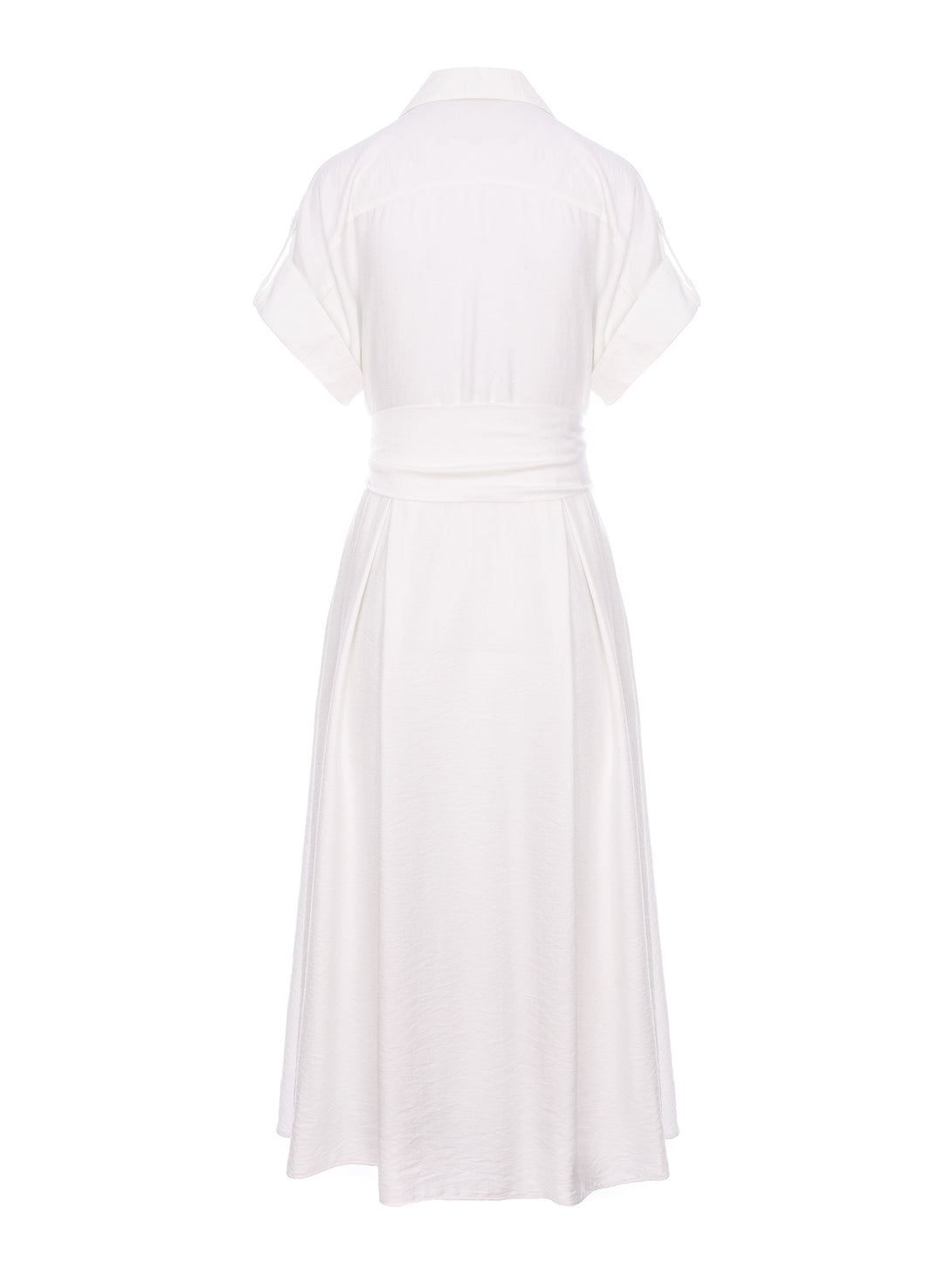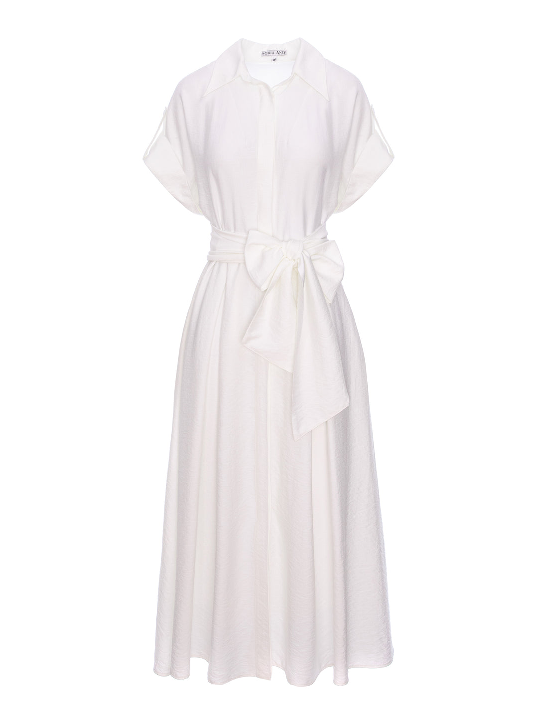 Realizată dintr-un material ușor și plăcut la purtare, rochia are mâneci scurte, guler clasic și închidere frontală cu nasturi ascunși. Talia este evidențiată printr-un cordon lat, ce se leagă într-o fundă spectaculoasă, adăugând un plus de stil și feminitate. Fusta amplă, evazată, conferă lejeritate și eleganță, făcând această piesă versatilă, potrivită atât pentru ținute de zi, cât și pentru evenimente speciale.